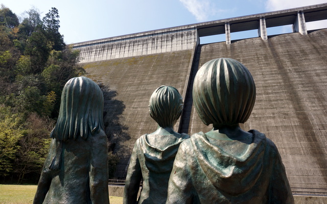 壁(大山ダム)の向こうに超大型巨人が現れてビツクリしている3人の銅像を見に行ってきました。