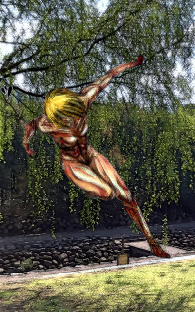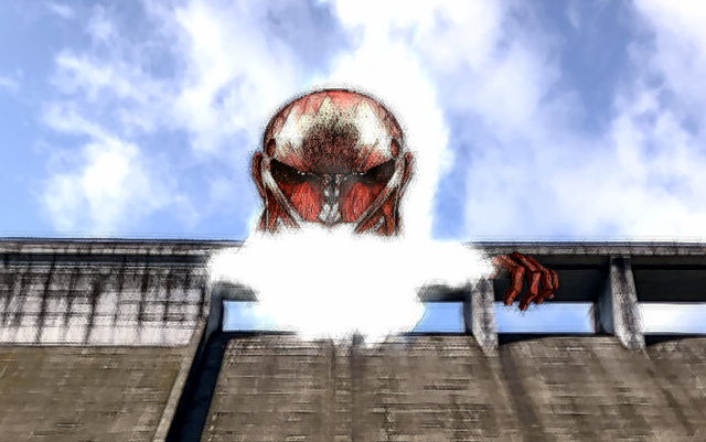 「進撃の日田」と題した町おこしの一環として、「進撃の日田AR」というのも市内のあちこちに用意されてまして、わざわざ見に行ったエレンとミカサとアルミンが壁を呆然と眺める銅像の横で専用のアプリを起動して見ると、こんな感じで超大型巨人が現れる!ってな寸法でした。(下の画像は巨人部分をアップにして切り取っています)