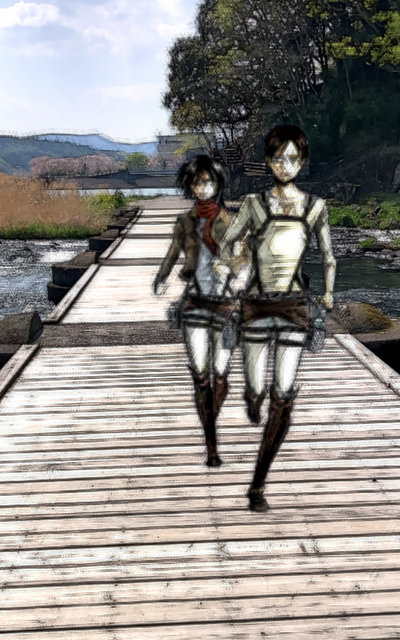 さすがに7回もやったらだいぶコツがわかってきて、かっぱ橋を駆けてくるエレンとミカサを撮るときには、橋の上にいた釣り人を上手にふたりの後ろに隠してやったぜ。こんなん上達しても仕方ないけども笑。