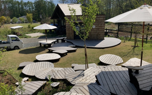 お隣の小屋は展示スペース。そこへのアプローチが、椅子になったり、テーブルになったり、カフェに入りきらないお客さんを懐広く受け入れてくれそうなスマートな設えでした。