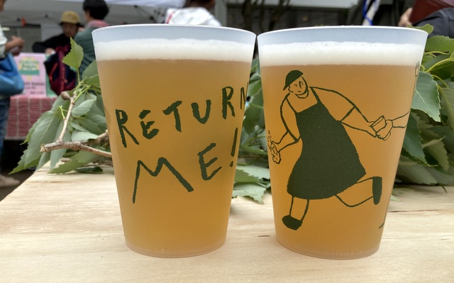ゴミの少ないマーケットを目指しているとのことで、マイバッグやマイ食器の持参が推奨されていたようですが、知らなかったので、レンタルコップを利用しました。「RETURN ME!」って書いてます。