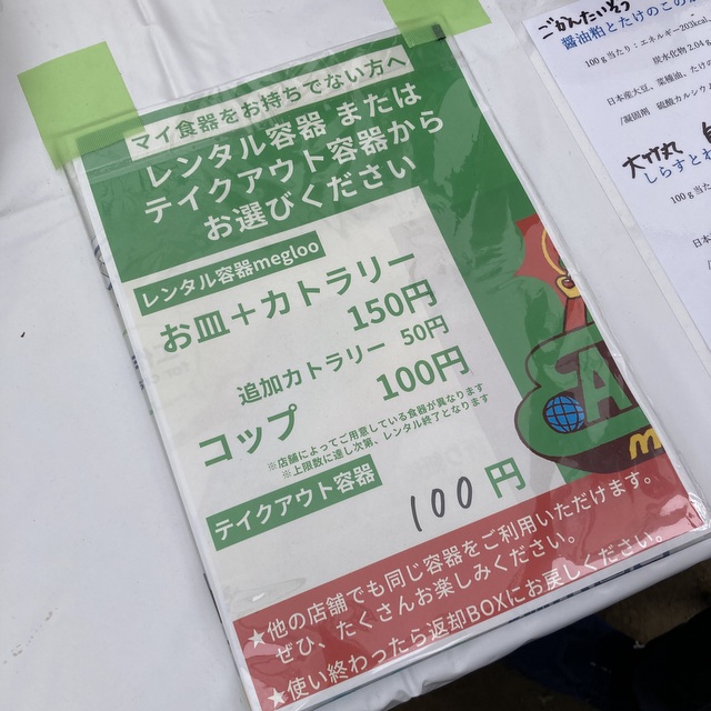 気になったのは、テイクアウト容器のほうがお値段が安いこと。それだと「安い」というそれだけの理由で、レンタルではなくテイクアウトを選択する人がいるのでは? いや、ちょっと待てよ……。「使い捨て容器」ではなく「テイクアウト容器」と言っているので、その辺のゴミ箱に捨てられる使い捨て容器ではなく、自宅へ持ち帰り再利用できる容器だったのかな? うー、テイクアウト容器を見せてもらうべきだった……。