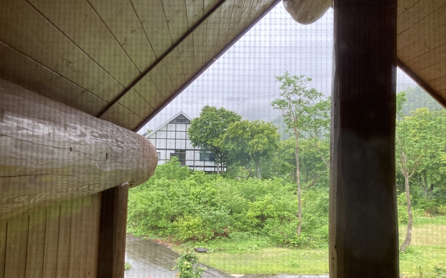 寝室の窓の向こうには新緑がざわざわしていて、窓を開けると(しつこいようですが笑)モリアオガエルの鳴き声が聞こえてきました。ただし、窓を閉めた状態だと無音。さすがの気密性という感じ。