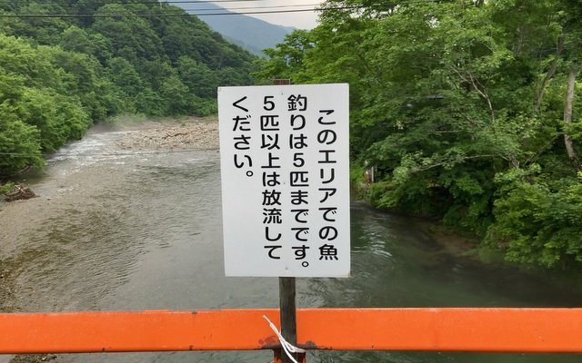 ログハウスのお宿から奥只見湖までジョギングしている途中で見かけた注意書き。湖へそそぐ川の上流では釣りが禁止されているのですが、湖まで1キロほどのところで解禁になります。でも上限があるらしい。