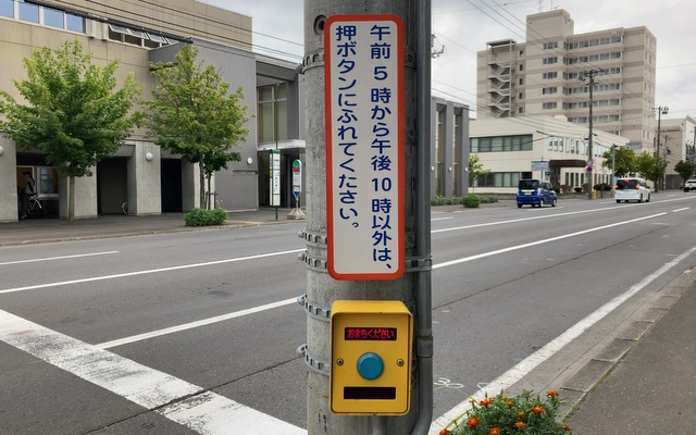 あちこち遊び歩いていると、先々で一瞬考えさせられる案内に遭遇します。そんなモノたちを集めてみました。2つ目は、札幌の実家ちかくにある横断歩道が押しボタン式になる時間帯の案内……