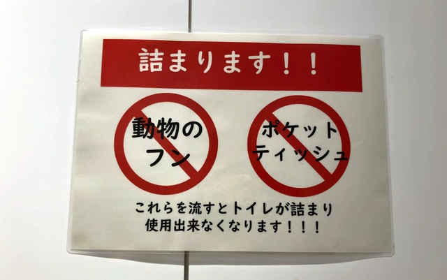 人間のフンは流れるけど、動物のフンは詰まるの? そ、そうなの? 犬のフンをポケットティッシュでくるんで流したら詰まっちゃったって感じとかかな? 気になったので調べてみたら、「動物のフンに砂や土が混ざっていた場合、下水管に堆積して詰まる原因になる」可能性があるということらしい。なるほどー、ペット界隈もわたしの知らない世界だな。張り紙にも、理由を書いてくれたほうが納得しやすいかも。普段、自宅のトイレに流している飼い主さんとしては、外でも同じように対処して良しって考えちゃうかもしれませんしねー。