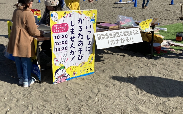 横浜市金沢区内で開催されるイベントへ行くと、「いっしょにかるたあそびしませんか!」と誘われることがあります。下の写真は、今年はじめのどんど焼き会場で見かけたお誘い。