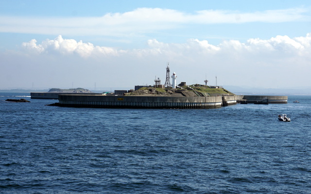 出航後、40分くらいで最初の見どころである東京湾要塞 第二海堡が見えてきます。明治から大正にかけての時代に、鋸山から切り出した石材を使ってつくられた人工島。その昔には大砲などが設置されていたそうな。ちなみに左手奥にうっすら写っている島が第一海堡です。
