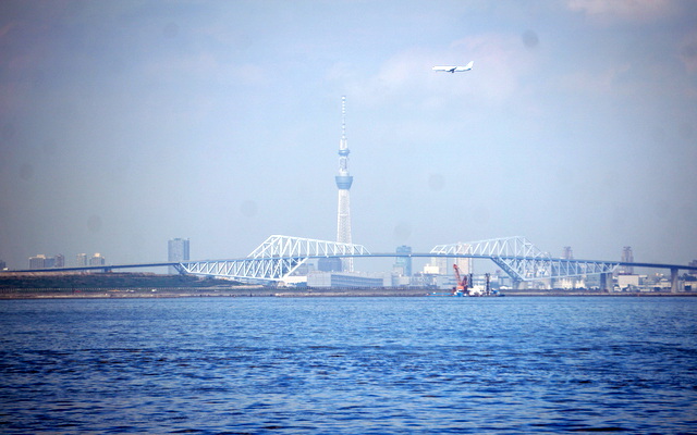 そして、レインボーブリッジと、上空を飛ぶ飛行機、そしてかなーり遠くにスカイツリーです。ガスってましたがなんとか見えました。レンズが汚れててゴメンナサイ。