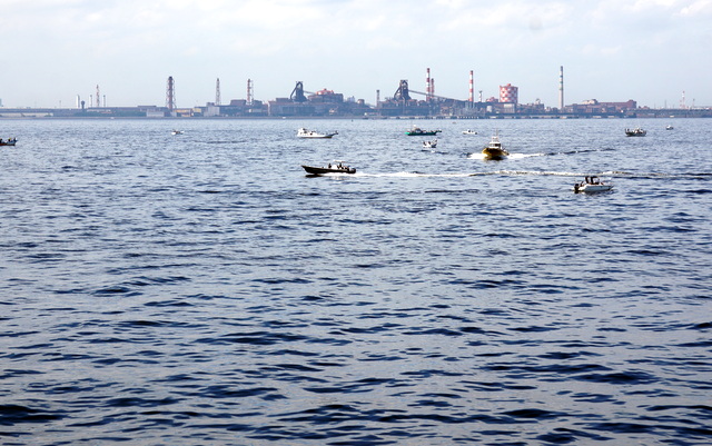 その後、東京湾内を南下しながら、川崎の重工業地帯のあたりで小舟(釣り船?)が渋滞してたり、